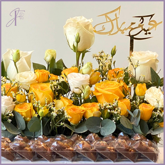 Eid Radiance Gift Tray - Festive Flowers, Chocolates, Lamp & Eid Sign