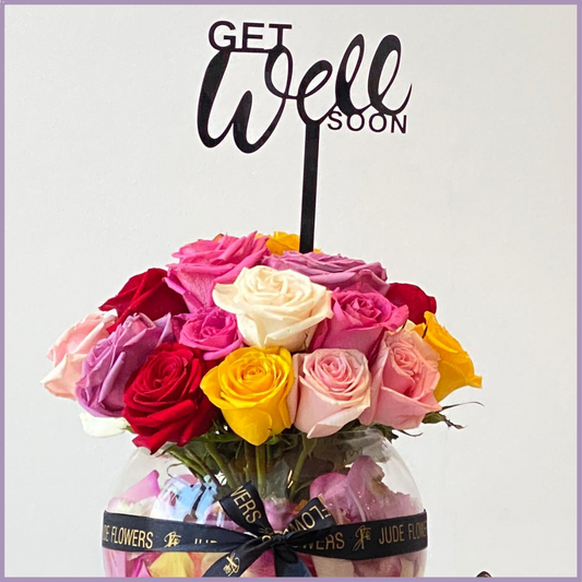 Healing Bloom & Sweet Indulgence - 25 Roses & "Get Well Soon" Acrylic