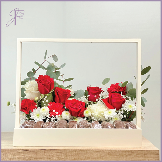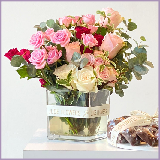 The Petal & Treat Arrangement - Rose & Spray Rose Gift Set with Assorted Chocolates