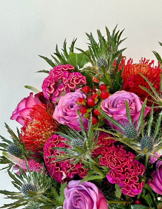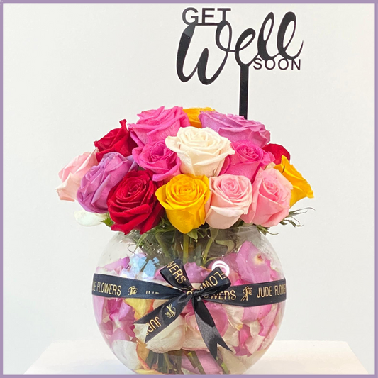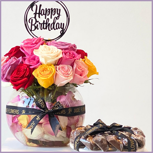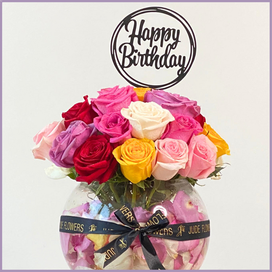 The Happy Birthday Rose Petal Vase - Mixed Roses in a Glass Vase with Acrylic Topper