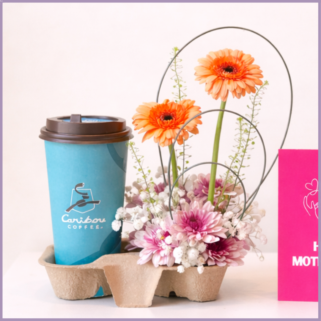 A cheerful Mother’s Day surprise combining fresh flowers with a warm cup of Caribou Coffee.
