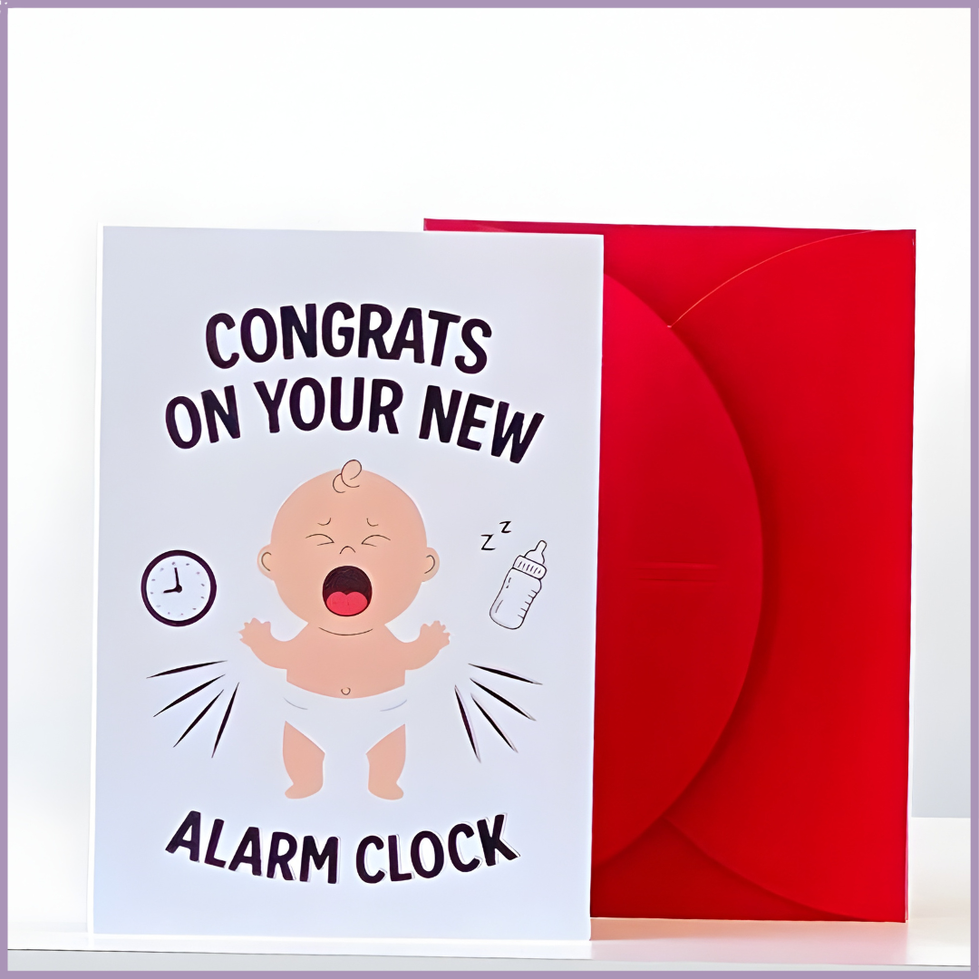 This funny card reads “Congrats on your new alarm clock” with a crying baby illustration, perfect for celebrating new moms and dads who are about to meet their cutest (and loudest) wake-up call yet. Includes a red envelope. Size: 17 cm × 12 cm