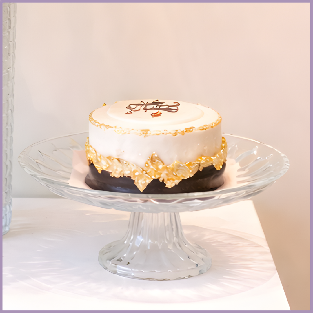 يأتي مع كيكة شوكولاتة فيريرو بوزن تقريبي ٠٫٥ كجم من دريم بايتس مقدمة على حامل كيك زجاجي، بالإضافة إلى بطاقة عيد مبارك من وجود فلاورز