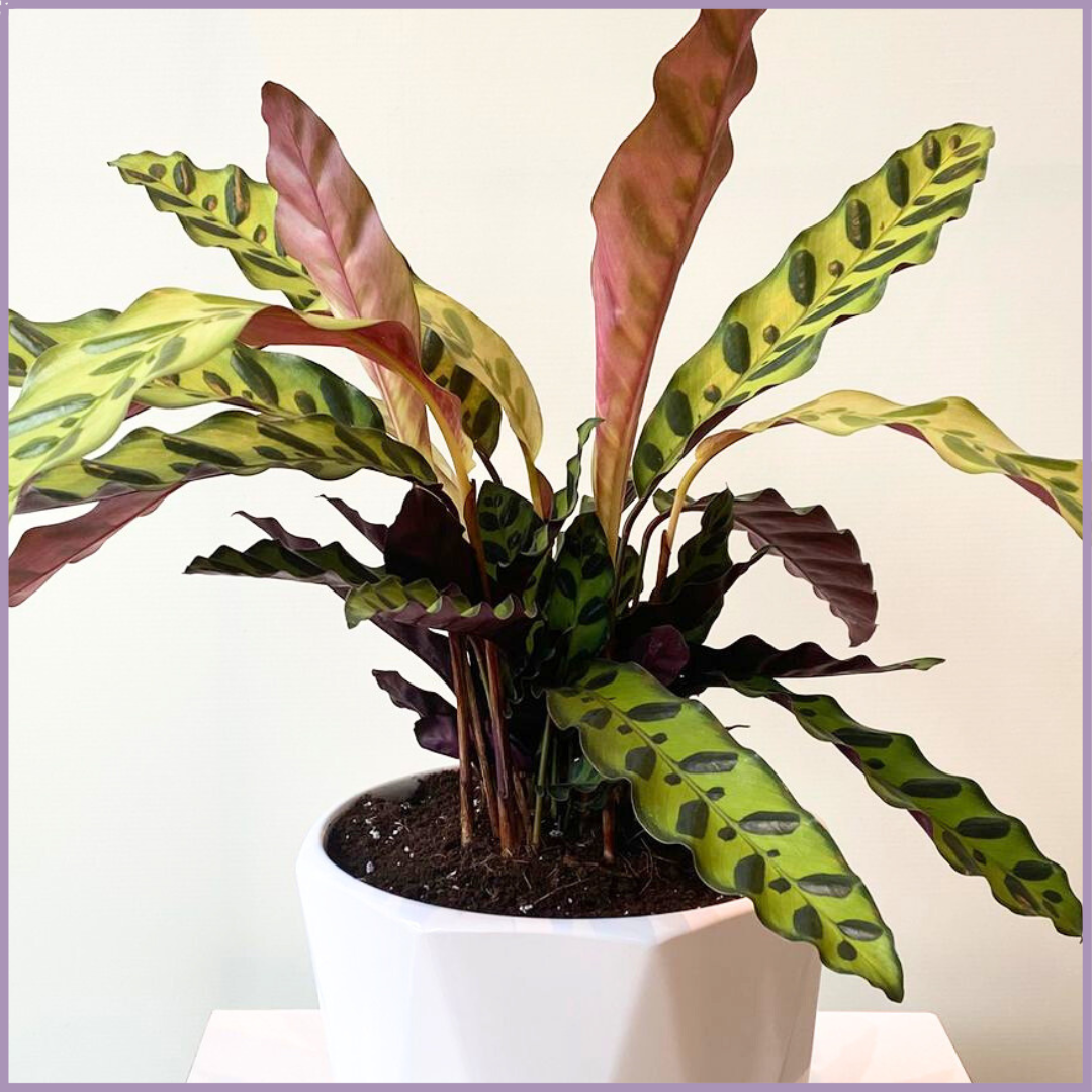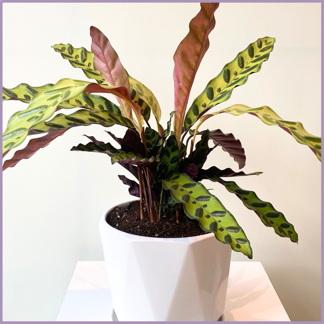 Includes 1 Calathea Lancifolia plant and 1 white ceramic pot.