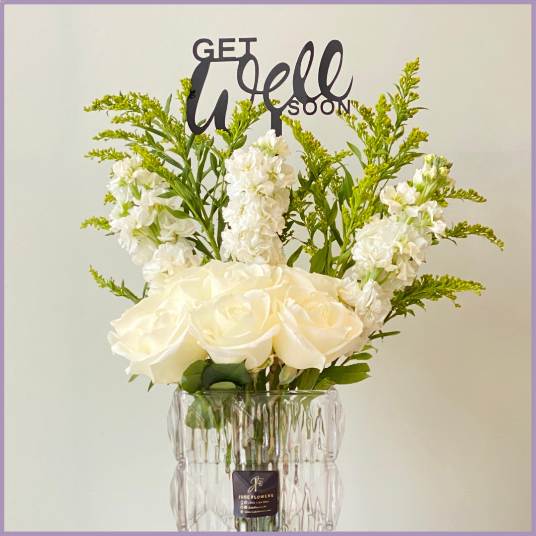 تنسيق زهور بيضاء أنيق لإرسال مشاعر الدعم والراحة يحتوي على ٧ ورود بيضاء طازجة ٣ سيقان ماثيولا بيضاء و٢ سيقان سوليداغو مرتب داخل فازة زجاجية شفافة ومزين بتوبيير جت ويل سون الأكريليك هدية راقية للتعبير عن الاهتمام وتمنيات الشفاء