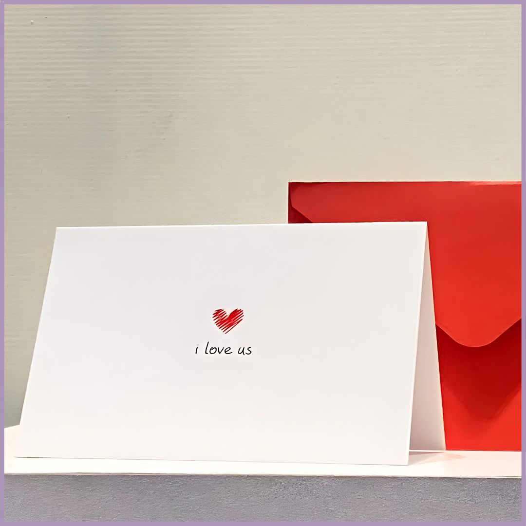 بطاقة تهنئة بسيطة وأنيقة تحمل عبارة “I love us” مع قلب أحمر صغير تعبر عن الحب والترابط والمشاركة. مناسبة لذكرى الزواج أو عيد الحب أو أي مناسبة رومانسية مميزة